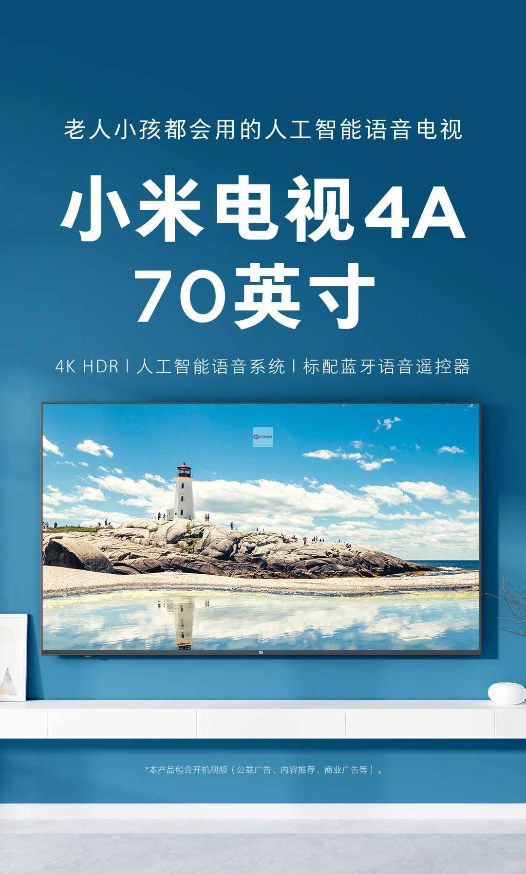 商品名稱:小米電視4A 70英寸 4K超高清 HDR 二級能效 2GB+16GB L70M5-4A 內置小愛 智能網絡液晶平板教育電視