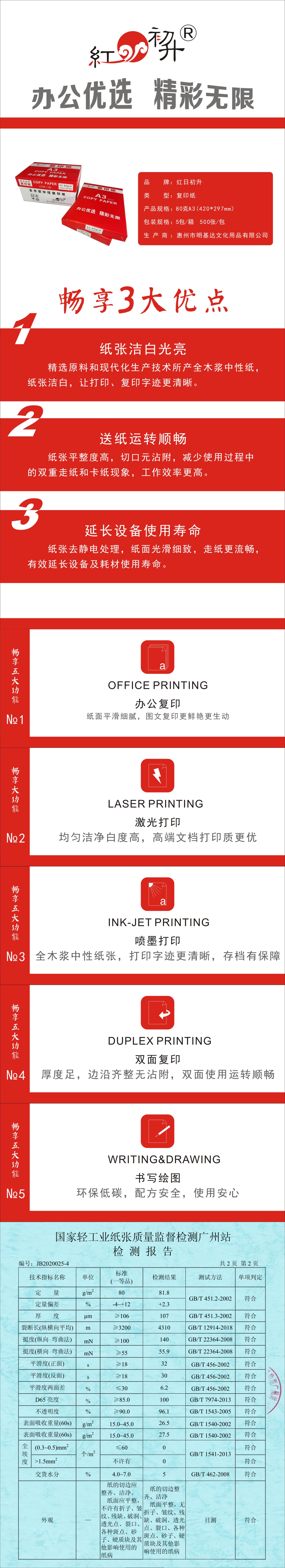 商品名稱:紅日初升 紅日初升 A3 80g 復(fù)印紙 500張/包 5包/箱 A3/80G