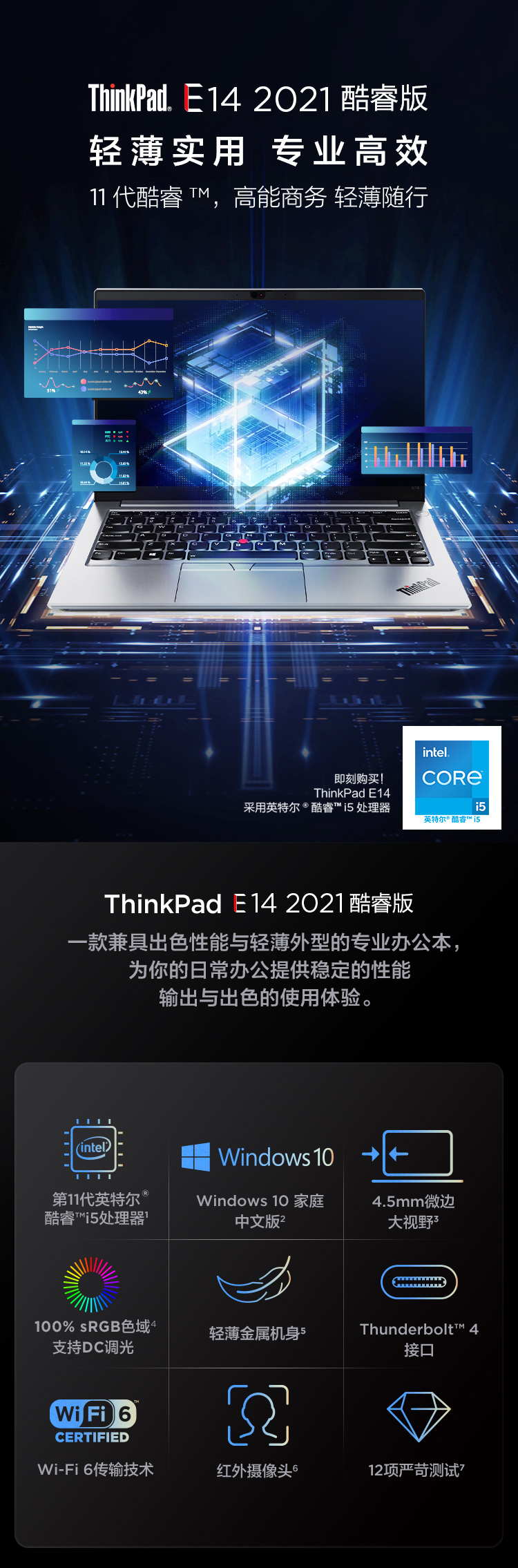 商品名稱:聯(lián)想ThinkPad E14 2021 居家辦公本 酷睿版 英特爾酷睿i5 14英寸輕薄筆記本(i5-1135G7 16G 512G 100%sRGB)銀