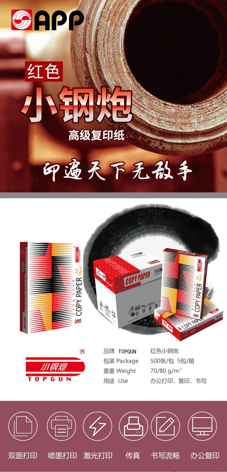 商品名稱:小鋼炮(T0PGUN) 系列三星小鋼炮 復(fù)印紙打印紙辦公用紙A4/70克/5包裝/整箱