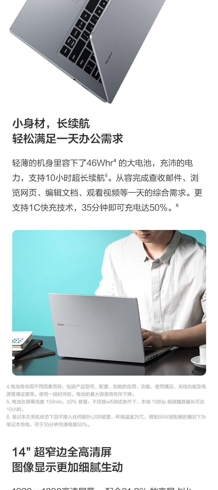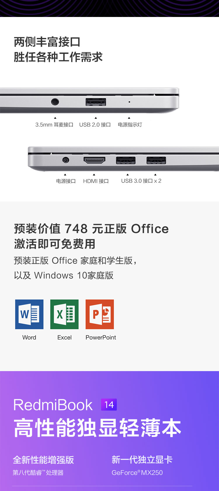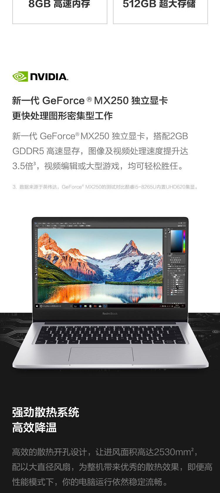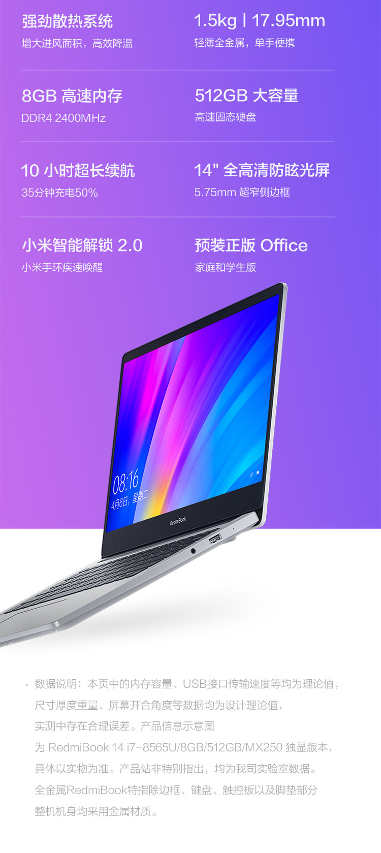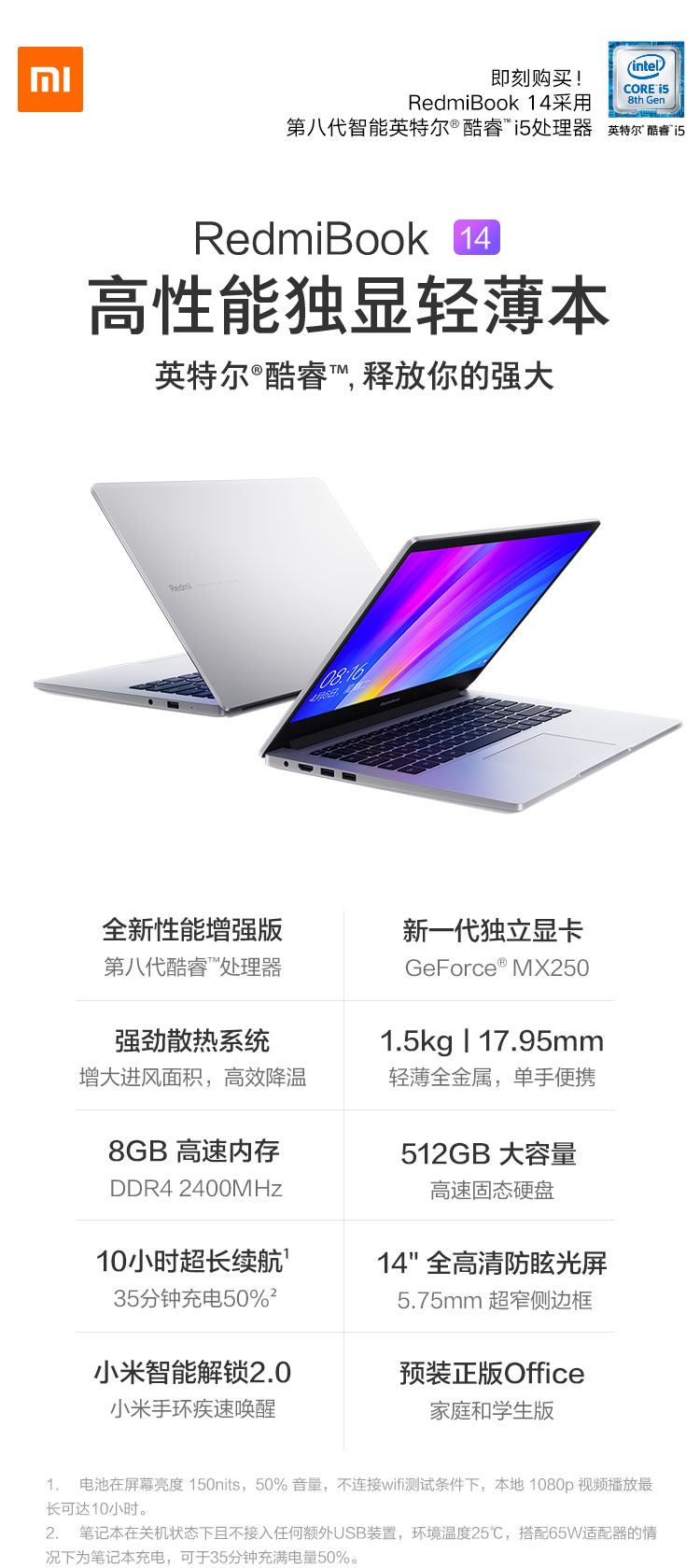 自營RedmiBook 14英寸全金屬超輕薄(第八代英特爾酷睿i5-8265U 8G 512G SSD MX250 2G獨(dú)顯 Office 支持手環(huán)疾速解鎖 Win10)游戲 銀 筆記本 小米 紅米