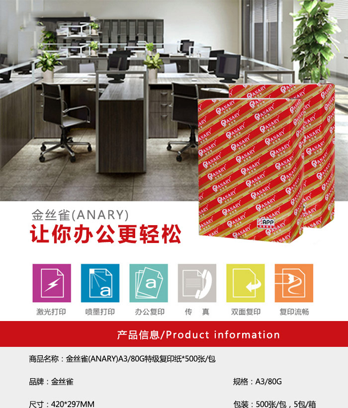 商品名稱:金絲雀(ANARY) 8K/80G 特級復印紙*500張/包*5包 白色