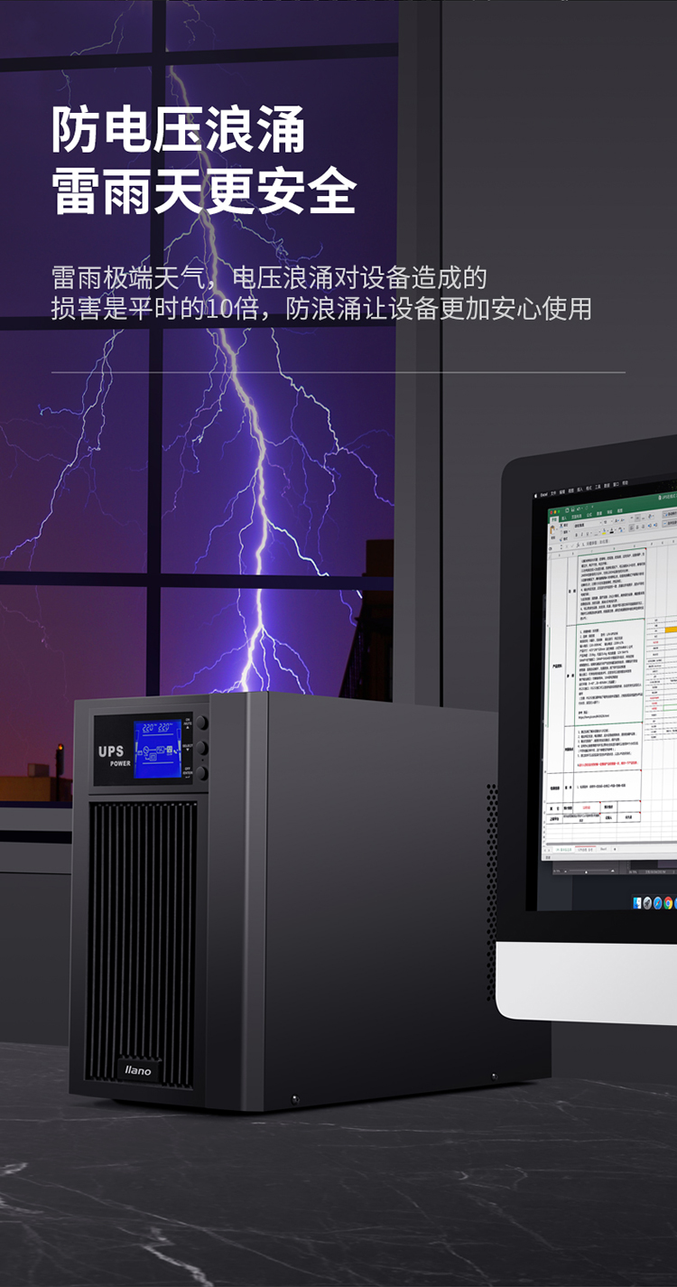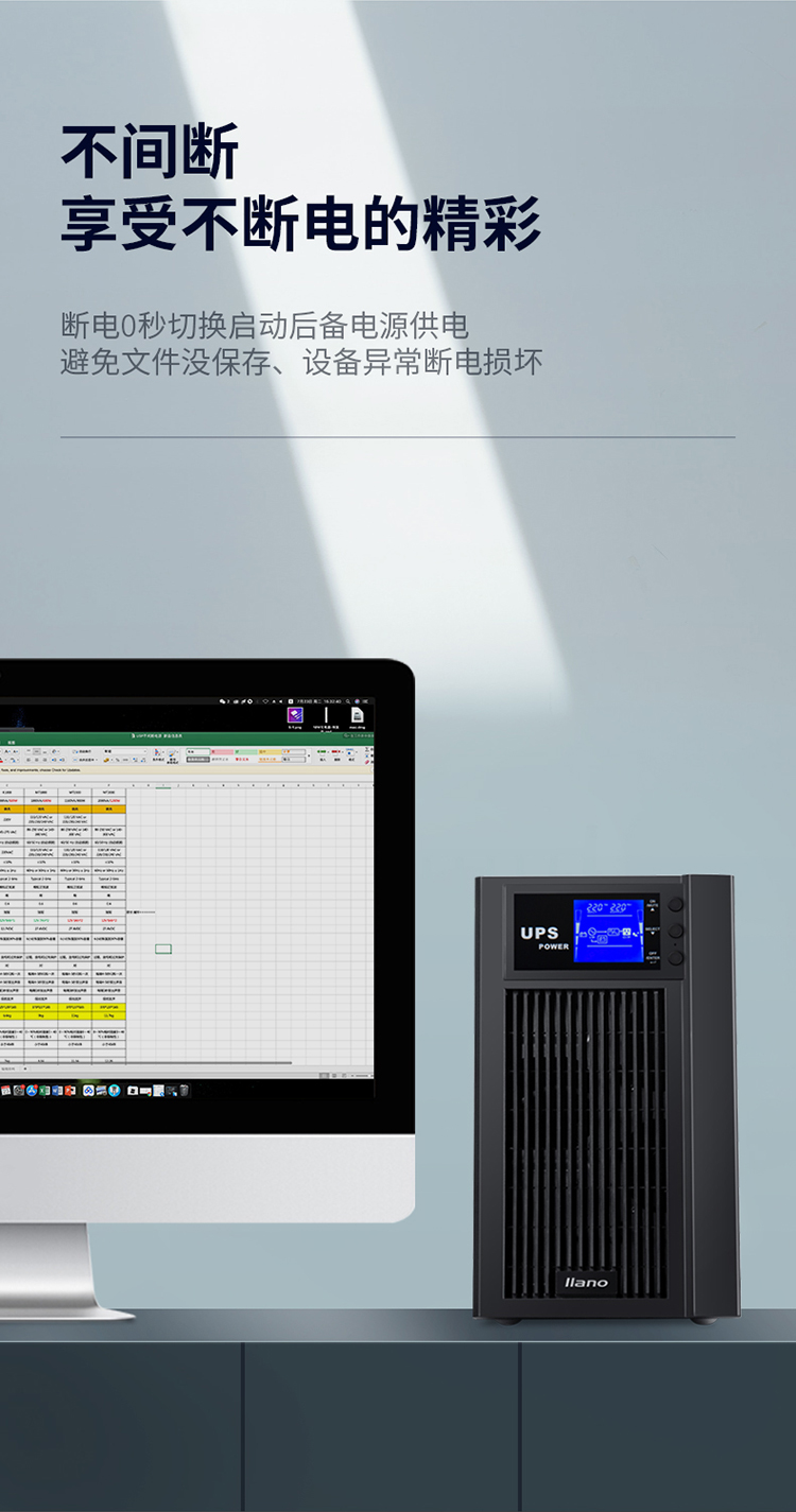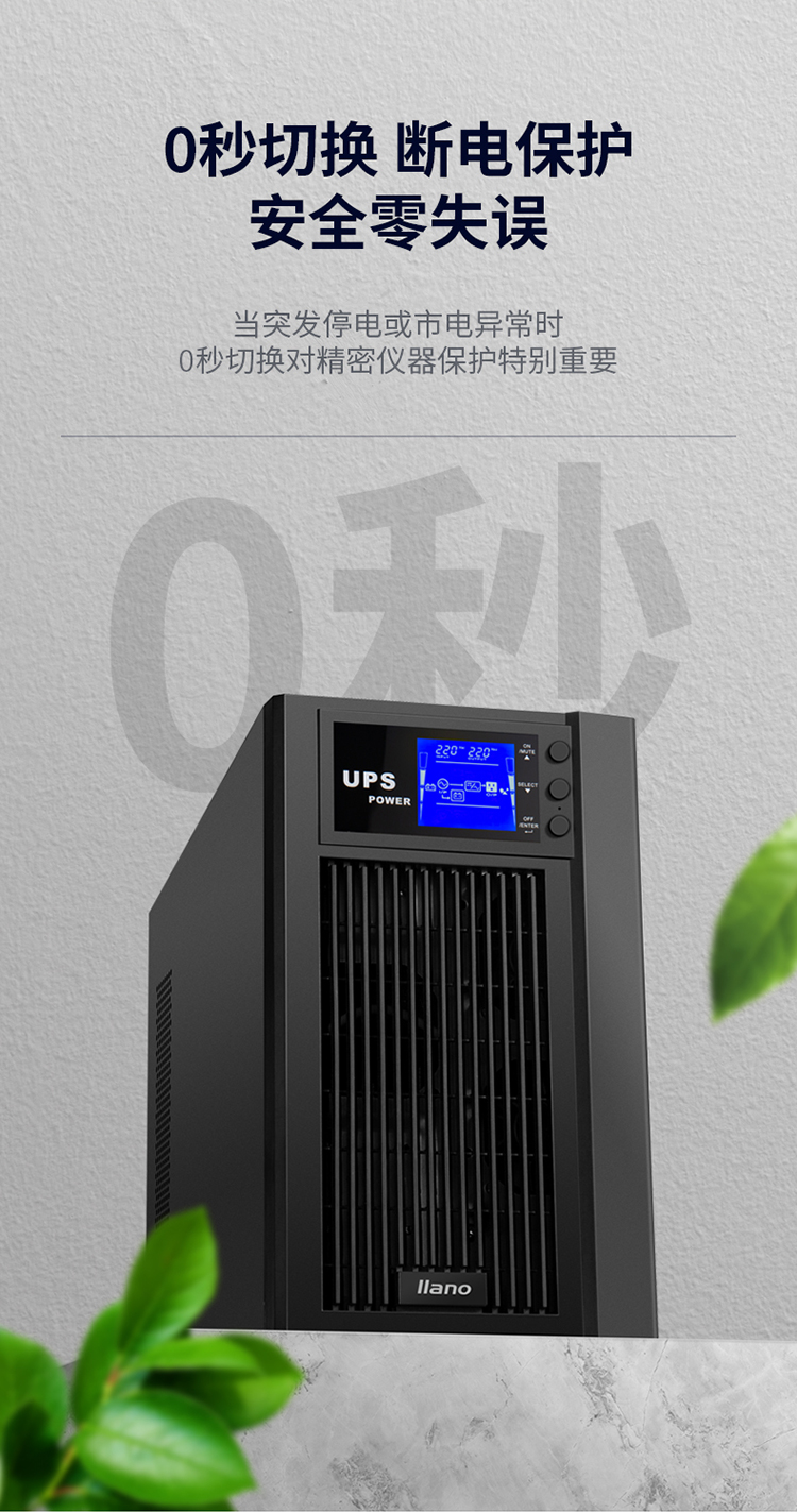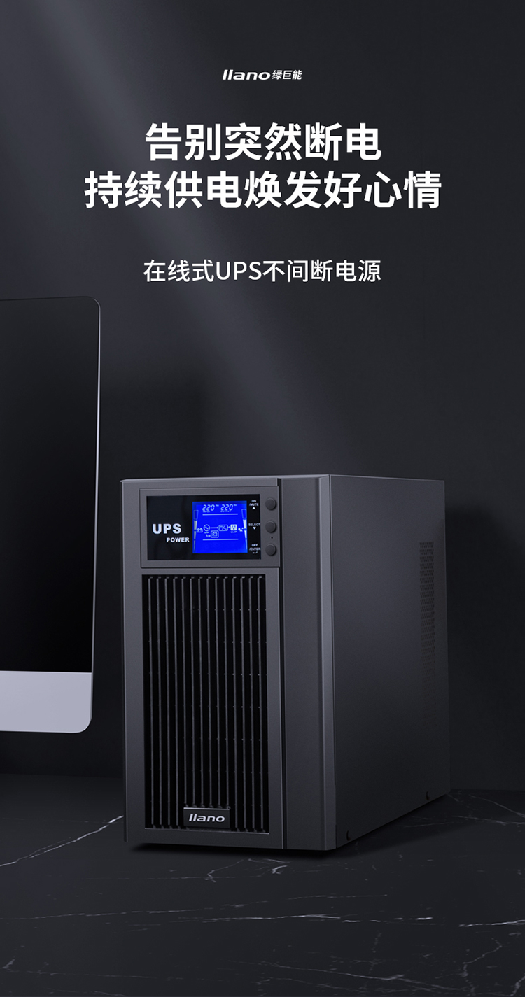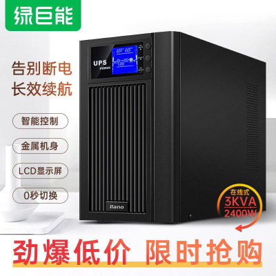 自營綠巨能(llano)UPS電源家用 不間斷電源 服務(wù)器辦公電腦后備電源 金屬外殼 在線式 3KVA/2400W 9AH電池*6