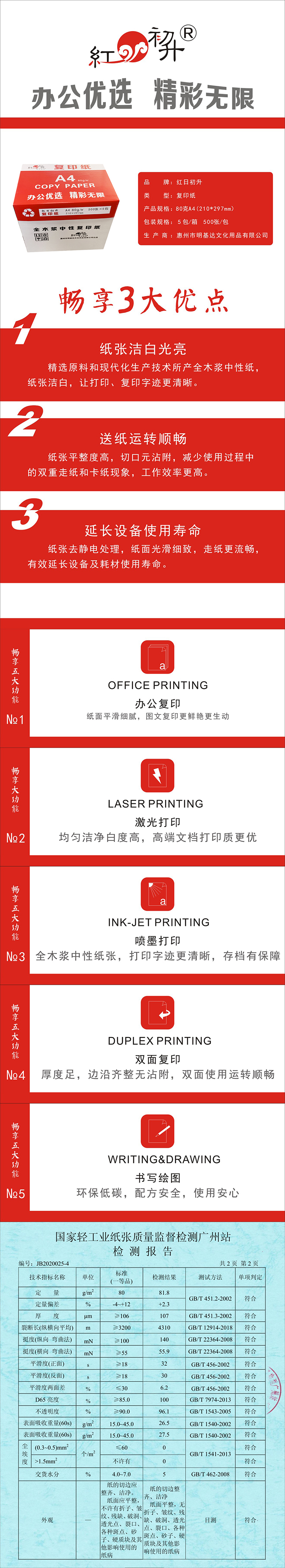 商品名稱:紅日初升 A4 80g 復印紙 500張/包 5包/箱