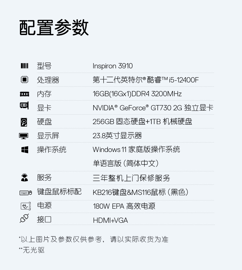 商品名稱:戴爾DELL靈越3910 家用辦公電腦 商務臺式機電腦主機(12代i5-12400F 16G 256G+1T 2G獨顯 )23.8英寸整機