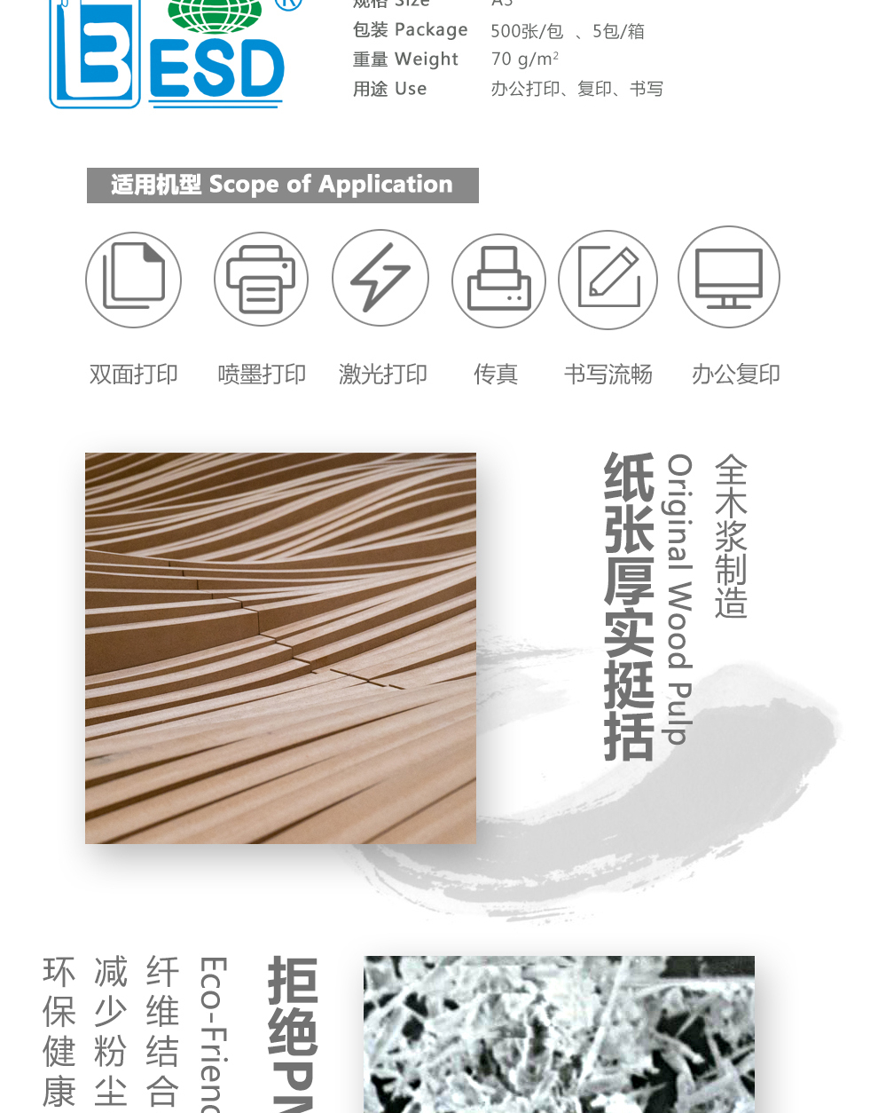 自營(yíng)金光(APP)藍(lán)色百事達(dá)(Besd)A3/70g 復(fù)印紙 500張/包 5包/箱(2500張)